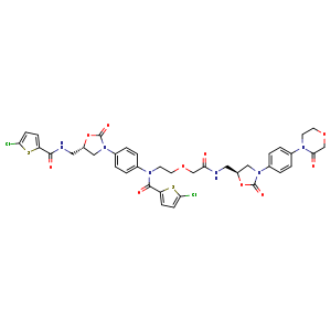 | SMILES | C(C(=O)NC[C@H]1CN(C(O1)=O)c2ccc(cc2)N3C(COCC3)=O)OCCN(C(=O)c4ccc(s4)Cl)c5ccc(cc5)N6C(O[C@H](C6)CNC(c7ccc(s7)Cl)=O)=O |
