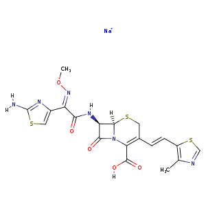 | SMILES | N12C(=O)[C@H]([C@]1(SCC(=C2C([O-])=O)/C=C\c3c(ncs3)C)[H])NC(\C(\c4nc(N)sc4)=N/OC)=O.[Na+] |