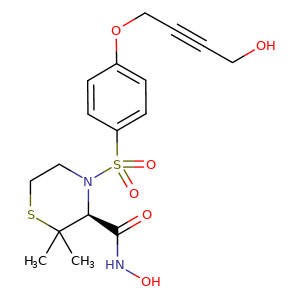 | 异名/同义词 | (3S)-N-HYDROXY-4-((4-((4-HYDROXYBUT-2-YNYL)OXY)PHENYL)SULFONYL)-2,2-DIMETHYLTHIOMORPHOLINE-3-CARBOXAMIDE 3-THIOMORPHOLINECARBOXAMIDE, N-HYDROXY-4-((4-((4-HYDROXY-2-BUTYNYL)OXY)PHENYL)SULFONYL)-2,2-DIMETHYL, (3S)- APRATASTAT APRATASTAT [USAN] TMI-005 TMI-05 APRATASTAT [INN]