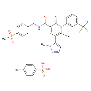 | SMILES | c1(cnc(cc1)CNC(=O)c2cc(c(n(c2=O)-c3cc(ccc3)C(F)(F)F)C)-c4n(ncc4)C)S(=O)(=O)C.c1(C)ccc(S(=O)(=O)O)cc1 |