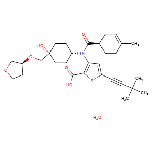 | 异名/同义词 | 2-THIOPHENECARBOXYLIC ACID, 5-(3,3-DIMETHYL-1-BUTYN-1-YL)-3-((CIS-4-HYDROXY-4-((((3S)-TETRAHYDRO-3-FURANYL)OXY)METHYL)CYCLOHEXYL)(((1R)-4-METHYL-3-CYCLOHEXEN-1-YL)CARBONYL)AMINO)-, HYDRATE 2-THIOPHENECARBOXYLIC ACID, 5-(3,3-DIMETHYL-1-BUTYN-1-YL)-3-((CIS-4-HYDROXY-4-((((3S)-TETRAHYDRO-3-FURANYL)OXY)METHYL)CYCLOHEXYL)(((1R)-4-METHYL-3-CYCLOHEXEN-1-YL)CARBONYL)AMINO)-, HYDRATE (1:1) RADALBUVIR MONOHYDRATE RADALBUVIR MONOHYDRATE [WHO-DD]