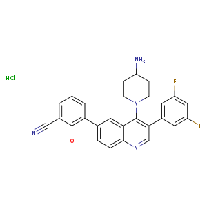 | SMILES | C(c1c(c(ccc1)-c2cc3c(c(cnc3cc2)-c4cc(cc(c4)F)F)N5CCC(CC5)N)O)#N.Cl |