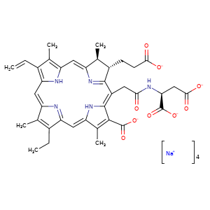 | 异名/同义词 | L-ASPARTIC ACID, N-(((7S,8S)-3-CARBOXY-7-(2-CARBOXYETHYL)-13-ETHENYL-18-ETHYL-7,8-DIHYDRO-2,8,12,17-TETRAMETHYL-21H,23H-PORPHIN-5-YL)ACETYL)-, TETRASODIUM SALT LASERPHYRIN LS-11 ME 2906 ME-2906 TALAPORFIN SODIUM TALAPORFIN SODIUM [JAN] TALAPORFIN SODIUM [MART.] TALAPORFIN SODIUM [USAN] TALAPORFIN TETRASODIUM SALT TALAPORFIN TETRASODIUM SALT [MI] TAPORFIN SODIUM TALAPORFIN SODIUM [WHO-DD] TETRASODIUM (2S)-2-((((7S,8S)-3-CARBOXYLATO-7-(2-CARBOXYLATOETHYL)-13-ETHENYL-18-ETHYL-2,8,12,17-TETRAMETHYL-7,8-DIHYDROPORPHYRIN-5-YL)ACETYL)AMINO)BUTANEDIOATE