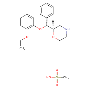 | SMILES | S(=O)(O)(C)=O.O([C@@H]([C@@]1(OCCNC1)[H])c2ccccc2)c3c(OCC)cccc3 |