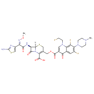 | 异名/同义词 | 5-THIA-1-AZABICYCLO(4.2.0)OCT-2-ENE-2-CARBOXYLIC ACID, 7-(((2Z)-(2-AMINO-4-THIAZOLYL)(METHOXYIMINO)ACETYL)AMINO)-3-((((6,8-DIFLUORO-1-(2-FLUOROETHYL)-1,4-DIHYDRO-7-(4-METHYL-1-PIPERAZINYL)-4-OXO-3-QUINOLINYL)CARBONYL)OXY)METHYL)-8-OXO-, (6R,7R)- RO-23-9424