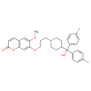 o1c(=O)ccc2cc(c(OCCCN3CCC(CC3)C(c4ccc(cc4)F)(c5ccc(cc5)F)O)cc12)OC