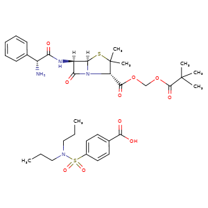 N12[C@@]([H])([C@@H](C1=O)NC([C@@H](c3ccccc3)N)=O)SC([C@@H]2C(OCOC(C(C)(C)C)=O)=O)(C)C.c1c(ccc(c1)C(O)=O)S(N(CCC)CCC)(=O)=O