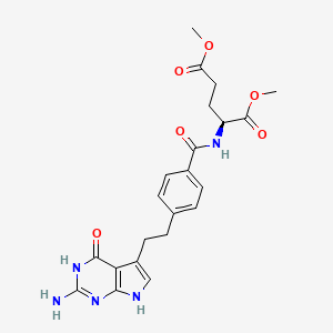 | 异名/同义词 | (S)-DIMETHYL 2-(4-(2-(2-IMINO-4-OXO-2,3,4,7-TETRAHYDRO-1H-PYRROLO(2,3-D)PYRIMIDIN-5-YL)ETHYL)BENZAMIDO)PENTANEDIOATE 1,5-DIMETHYL N-(4-(2-(2-AMINO-4,7-DIHYDRO-4-OXO-3H-PYRROLO(2,3-D)PYRIMIDIN-5-YL)ETHYL)BENZOYL)-L-GLUTAMATE L-GLUTAMIC ACID, N-(4-(2-(2-AMINO-4,7-DIHYDRO-4-OXO-1H-PYRROLO(2,3-D)PYRIMIDIN-5-YL)ETHYL)BENZOYL)-, DIMETHYL ESTER L-GLUTAMIC ACID, N-(4-(2-(2-AMINO-4,7-DIHYDRO-4-OXO-3H-PYRROLO(2,3-D)PYRIMIDIN-5-YL)ETHYL)BENZOYL)-, 1,5-DIMETHYL ESTER N-(4-(2-(2-AMINO-4,7-DIHYDRO-4-OXO-3H-PYRROLO(2,3-D)PYRIMIDIN-5-YL)ETHYL)BENZOYL)-L-GLUTAMIC ACID 1,5-DIMETHYL ESTER PEMETREXED DIMETHYL ESTER PEMETREXED DIMETHYL ESTER, S- PEMETREXED METHYL ESTER