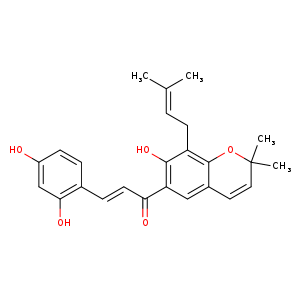 | 异名/同义词 | (E)-3-(2,4-DIHYDROXYPHENYL)-1-(7-HYDROXY-2,2-DIMETHYL-8-(3-METHYLBUT-2-ENYL)CHROMEN-6-YL)PROP-2-EN-1-ONE 2-PROPEN-1-ONE, 3-(2,4-DIHYDROXYPHENYL)-1-(7-HYDROXY-2,2-DIMETHYL-8-(3-METHYL-2-BUTEN-1-YL)-2H-1-BENZOPYRAN-6-YL)- 2-PROPEN-1-ONE, 3-(2,4-DIHYDROXYPHENYL)-1-(7-HYDROXY-2,2-DIMETHYL-8-(3-METHYL-2-BUTEN-1-YL)-2H-1-BENZOPYRAN-6-YL)-, (2E)- 6-(3-(2',4'-DIHYDROXYPHENYL)ACRYLOYL)-7-HYDROXY-2,2-DIMETHYL-8-(3-METHYL-2-BUTENYL)-2H-BENZOPYRAN COMPOUND 6