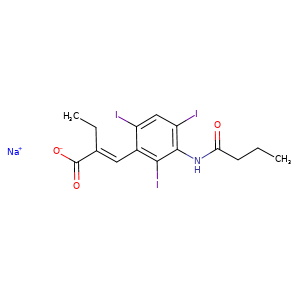 | 异名/同义词 | .ALPHA.-(2,4,6-TRIIODO-3-BUTYRYLAMINOBENZYLIDENE)BUTYRIC ACID SODIUM SALT .ALPHA.-ETHYL-.BETA.-(2,4,6-TRIIODO-3-BUTYRAMIDOPHENYL)ACRYLIC ACID SODIUM SALT 2-((2,4,6-TRIIODO-3-((1-OXOBUTYL)AMINO)PHENYL)METHYLENE)BUTANOIC ACID MONOSODIUM SALT 2-(3-BUTYRAMIDO-3,4,6-TRIIODOPHENYLMETHYLENE)BUTYRIC ACID SODIUM SALT 3-(3-BUTYRYLAMINO-2,4,6-TRIIODOPHENYL)-2-ETHYL SODIUM ACRYLATE 3-(3-BUTYRYLAMINO-2,4,6-TRIIODOPHENYL)-2-ETHYLACRYLIC ACID SODIUM SALT 3-(BUTYRYLAMINO)-ALPHA-ETHYL-2,4,6-TRIIODOCINNAMIC ACID SODIUM SALT BILI-ORAL BUNAIOD BUNAMIODYL SODIUM BUNAMIODYL SODIUM SALT BUNAMIODYL SODIUM SALT [MI] BUNIODYL SODIUM BUTANOIC ACID, 2-((2,4,6-TRIIODO-3-((1-OXOBUTYL)AMINO)PHENYL)METHYLENE)-, MONOSODIUM SALT BUNAMIODYL SODIUM [WHO-DD] CINNAMIC ACID, 3-BUTYRAMIDO-.ALPHA.-ETHYL-2,4,6-TRIIODO-, MONOSODIUM SALT ORABILEX ORABLIX SODIUM BUNAMIODYL