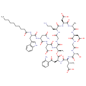 | SMILES | C([C@@H](C(N[C@@H](C(N[C@H](C(N[C@H]1[C@@H](C)OC(=O)[C@H](CC(=O)c2c(N)cccc2)NC(=O)[C@]([C@@H](CC(O)=O)C)(NC(=O)[C@@H](CO)NC(=O)CNC(=O)[C@H](CC(O)=O)NC(=O)[C@@H](C)NC(=O)[C@H](CC(O)=O)NC(=O)[C@H](CCCN)NC(=O)CNC1=O)[H])=O)CC(O)=O)=O)CC(N)=O)=O)NC(CCCCCCCCC)=O)c3c4c([nH]c3)cccc4 |