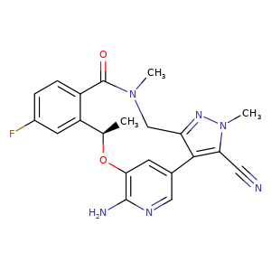 | SMILES | [C@@H]1(C)c2cc(F)ccc2C(=O)N(C)Cc3nn(C)c(C#N)c3-c4cc(c(N)nc4)O1 |