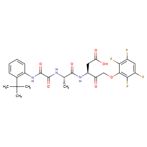 | 异名/同义词 | (3S)-3-((2S)-2-((N-(2-TERT-BUTYL)PHENYL)CARBAMOYL)CARBONYLAMINO) PROPANOYLAMINO)-4-OXO-5-(2,3,5,6-TETRAFLUOROPHENOXY)PENTANOIC ACID (3S)-3-(N2-((2-TERT-BUTYLPHENYL)OXAMOYL)-L-ALANINAMIDO)-4-OXO-5-(2,3,5,6-TETRAFLUOROPHENOXY)PENTANOIC ACID EMRICASAN EMRICASAN [USAN] EMRICASAN [WHO-DD] IDN 6556 IDN-6556 L-ALANINAMIDE, N-(2-(1,1-DIMETHYLETHYL)PHENYL)-2-OXOGLYCYL-N-((1S)-1-(CARBOXYMETHYL)-2-OXO-3-(2,3,5,6-TETRAFLUOROPHENOXY)PROPYL)- PF 03491390 PF-03491390 VAY-785 VAY785 EMRICASAN [INN]