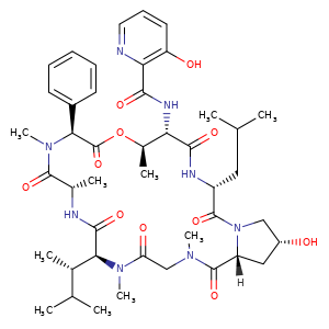 | SMILES | O=C1[C@@H](CC(C)C)NC(=O)[C@@H](NC(c2ncccc2O)=O)[C@@H](C)OC(=O)[C@H](c3ccccc3)N(C)C(=O)[C@H](C)NC(=O)[C@H]([C@@H](C)C(C)C)N(C)C(=O)CN(C)C(=O)[C@@]4([H])C[C@@H](O)CN41 |