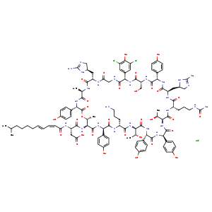 | SMILES | C1([C@@H](NC([C@H](NC([C@@H](NC(CNC([C@@H](NC([C@H](NC([C@@H](NC([C@H](NC([C@@H](NC([C@@H](NC([C@H](NC([C@@H](NC([C@H](NC([C@H](NC([C@H](NC([C@@H](NC([C@@H](NC(/C=C\C=C\CCCCC(C)C)=O)CC(=O)O)=O)[C@@H](C)O1)=O)c2ccc(cc2)O)=O)CCCN)=O)[C@@H](C)O)=O)c3ccc(cc3)O)=O)c4ccc(cc4)O)=O)[C@H](C)O)=O)CCCNC(=O)N)=O)C[C@@H]5CN=C(N5)N)=O)c6ccc(cc6)O)=O)CO)=O)c7cc(c(c(c7)Cl)O)Cl)=O)=O)C[C@@H]8CN=C(N8)N)=O)C)=O)c9ccc(cc9)O)=O.Cl |