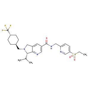 | 异名/同义词 | (7S)-N-((5-(ETHYLSULFONYL)PYRIDIN-2-YL)METHYL)-7-ISOPROPYL-6-(((TRANS)-4-(TRIFLUOROMETHYL)CYCLOHEXYL)METHYL)-6,7-DIHYDRO-5H-PYRROLO(3,4-B)PYRIDINE-3-CARBOXAMIDE 5H-PYRROLO(3,4-B)PYRIDINE-3-CARBOXAMIDE, N-((5-(ETHYLSULFONYL)-2-PYRIDINYL)METHYL)-6,7-DIHYDRO-7-(1-METHYLETHYL)-6-((TRANS-4-(TRIFLUOROMETHYL)CYCLOHEXYL)METHYL)-, (7S)- VIMIROGANT VIMIROGANT [INN]