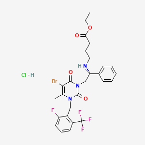 | 异名/同义词 | BUTANOIC ACID, 4-(((1R)-2-(5-BROMO-3-((2-FLUORO-6-(TRIFLUOROMETHYL)PHENYL)METHYL)-3,6-DIHYDRO-4-METHYL-2,6-DIOXO-1(2H)-PYRIMIDINYL)-1-PHENYLETHYL)AMINO)-, ETHYL ESTER, HYDROCHLORIDE (1:1) ETHYL 4-(((1R)-2-(5-BROMO-3-((2-FLUORO-6-(TRIFLUOROMETHYL)PHENYL)METHYL)-3,6-DIHYDRO-4-METHYL-2,6-DIOXO-1(2H)-PYRIMIDINYL)-1-PHENYLETHYL)AMINO)BUTANOATE HYDROCHLORIDE
