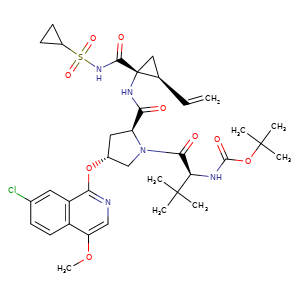 | SMILES | O=C(OC(C)(C)C)N[C@@H](C(C)(C)C)C(N1C[C@H](Oc2c3cc(Cl)ccc3c(OC)cn2)C[C@H]1C(N[C@]4(C(NS(C5CC5)(=O)=O)=O)C[C@H]4C=C)=O)=O |