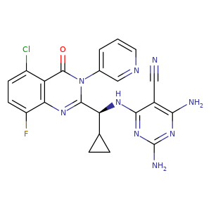 c1cc(F)c2nc([C@H](C3CC3)Nc4c(C#N)c(N)nc(N)n4)n(-c5cnccc5)c(=O)c2c1Cl