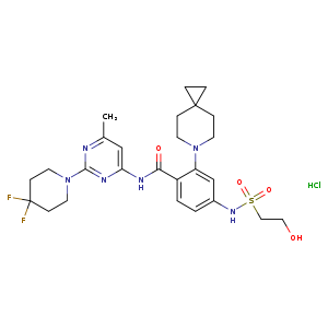 | 异名/同义词 | AMG 650 HYDROCHLORIDE AMG-650 HYDROCHLORIDE BENZAMIDE, 2-(6-AZASPIRO(2.5)OCT-6-YL)-N-(2-(4,4-DIFLUORO-1-PIPERIDINYL)-6-METHYL-4-PYRIMIDINYL)-4-(((2-HYDROXYETHYL)SULFONYL)AMINO)-, HYDROCHLORIDE BENZAMIDE, 2-(6-AZASPIRO(2.5)OCT-6-YL)-N-(2-(4,4-DIFLUORO-1-PIPERIDINYL)-6-METHYL-4-PYRIMIDINYL)-4-(((2-HYDROXYETHYL)SULFONYL)AMINO)-, HYDROCHLORIDE (1:1) SOVILNESIB HYDROCHLORIDE