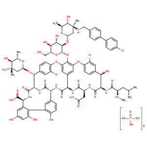 | SMILES | O=C1[C@@]2([H])c3cc(Oc4ccc([C@H]([C@]5(C(=O)N[C@]([H])(C(=O)O)c6cc(O)cc(O)c6-c7c(O)ccc(c7)[C@@]([H])(N1)C(=O)N5)[H])O[C@@]8([H])C[C@](C)(N)[C@@H](O)[C@H](C)O8)cc4Cl)c(O[C@H]9[C@H](O[C@]%10([H])O[C@@H](C)[C@H](O)[C@](NCc%11ccc(-c%12ccc(Cl)cc%12)cc%11)(C)C%10)[C@@H](O)[C@H](O)[C@@H](CO)O9)c(c3)Oc%13ccc(cc%13Cl)[C@@H](O)[C@@H](NC(=O)[C@@H](CC(C)C)NC)C(=O)N[C@@H](CC(=O)N)C(=O)N2.OP(O)(O)=O.OP(O)(O)=O |