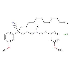 | SMILES | Cl.c1cc(cc(c1)C(C#N)(CCCCCCCCCCCC)CCCN(CCc2cc(ccc2)OC)C)OC |