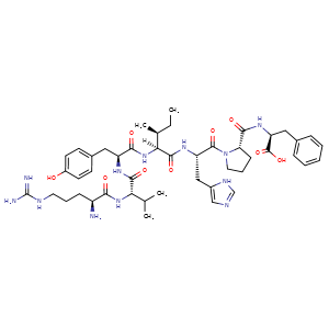 | 异名/同义词 | 2-8-ANGIOTENSIN II, 5-L-ISOLEUCINE- ALANINE, N-(1-(N-(N-(N-(N-L-ARGINYL-L-VALYL)-L-TYROSYL)-L-ISOLEUCYL)-L-HISTIDYL)-L-PROLYL)-3-PHENYL- ANGIOTENSIN II (2-8) ANGIOTENSIN III ANGIOTENSIN III (HUMAN) ANGIOTENSIN III (MOUSE) ANGIOTENSIN III, 4-L-ISOLEUCINE- ARG-VAL-TYR-ILE-HIS-PRO-PHE HUMAN ANGIOTENSIN III