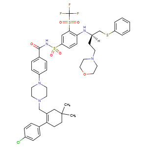 | SMILES | C(C1=C(CCC(C1)(C)C)c2ccc(cc2)Cl)N3CCN(CC3)c4ccc(cc4)C(NS(=O)(=O)c5cc(c(cc5)N[C@H](CCN6CCOCC6)CSc7ccccc7)S(C(F)(F)F)(=O)=O)=O |