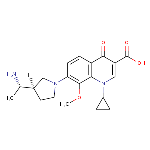 | SMILES | n1(cc(c(c2ccc(c(c12)OC)N3C[C@@](CC3)([C@H](C)N)[H])=O)C(=O)O)C4CC4 |