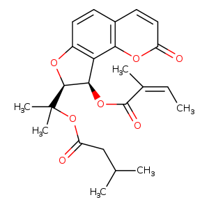 | 异名/同义词 | ((8S,9R)-8-(2-(3-METHYLBUTANOYLOXY)PROPAN-2-YL)-2-OXO-8,9-DIHYDROFURO(2,3-H)CHROMEN-9-YL) (Z)-2-METHYLBUT-2-ENOATE 2'-ANGELOYL-3'-ISOVALERYL VAGINATE 2-BUTENOIC ACID, 2-METHYL-, (8S,9R)-8,9-DIHYDRO-8-(1-METHYL-1-(3-METHYL-1-OXOBUTOXY)ETHYL)-2-OXO-2H-FURO(2,3-H)-1-BENZOPYRAN-9-YL ESTER, (2Z)- 2-BUTENOIC ACID, 2-METHYL-, 8,9-DIHYDRO-8-(1-METHYL-1-(3-METHYL-1-OXOBUTOXY)ETHYL)-2-OXO-2H-FURO(2,3-H)-1-BENZOPYRAN-9-YL ESTER, (8S-(8.ALPHA.,9.ALPHA.(Z)))-