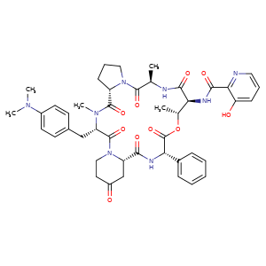 | SMILES | C[C@H]1NC(=O)[C@@H](NC(=O)c2ncccc2O)[C@@H](C)OC(=O)[C@@H](NC(=O)[C@@H]3CC(=O)CCN3C(=O)[C@H](Cc4ccc(N(C)C)cc4)N(C)C(=O)[C@@H]5CCCN5C1=O)c6ccccc6 |