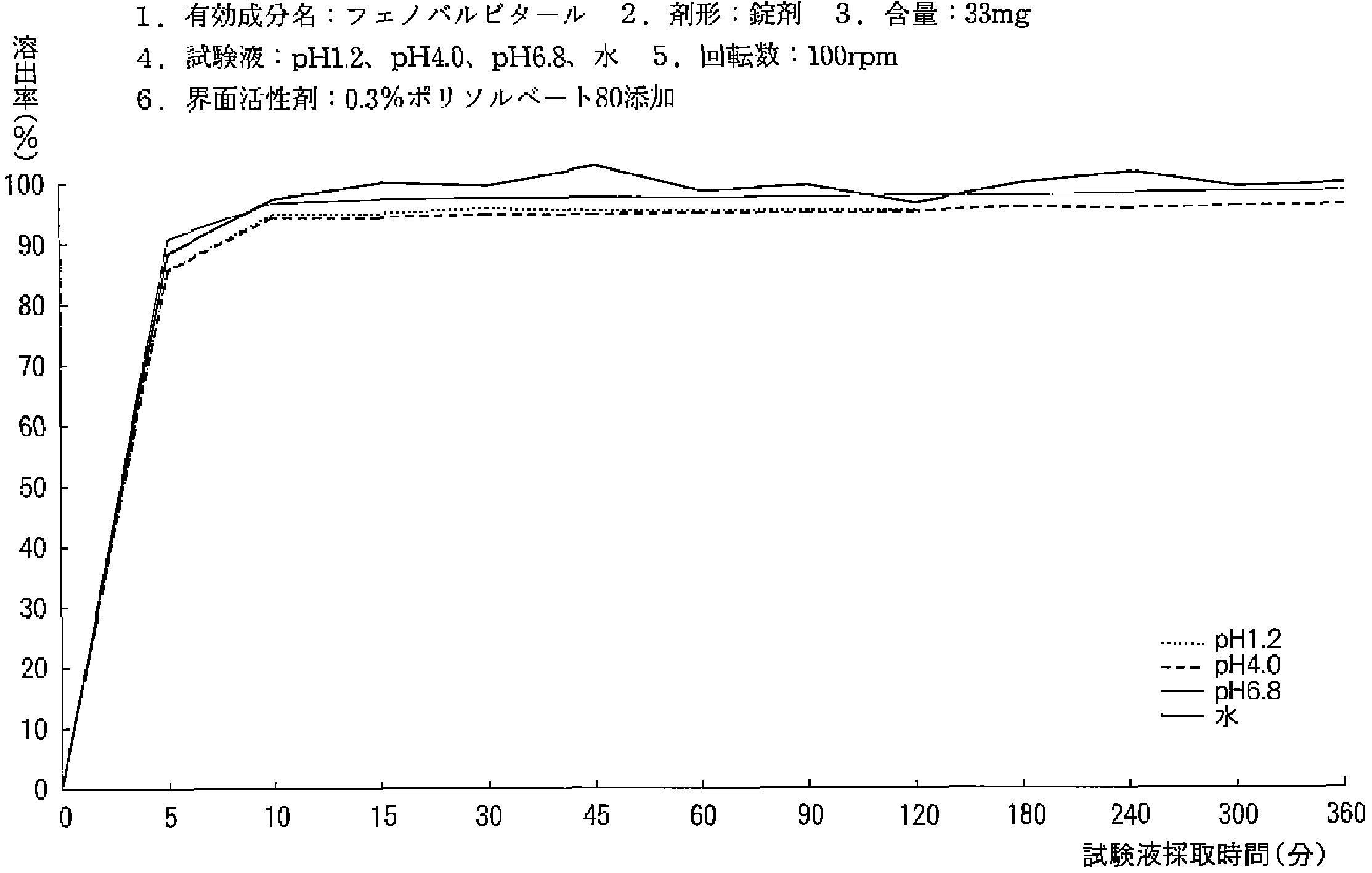| 溶出曲线测定例 | 成分名称:フェノバルビタール 英文名:Phenobarbital 含量:33mg ![]() |