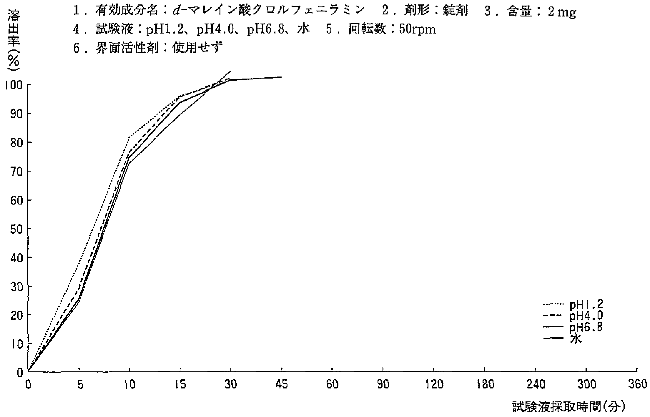 | 溶出曲线测定例 | 成分名称:d-マレイン酸クロルフェニラミン 英文名:d-Chlorpheniramine Maleate 含量:2mg ![]() |