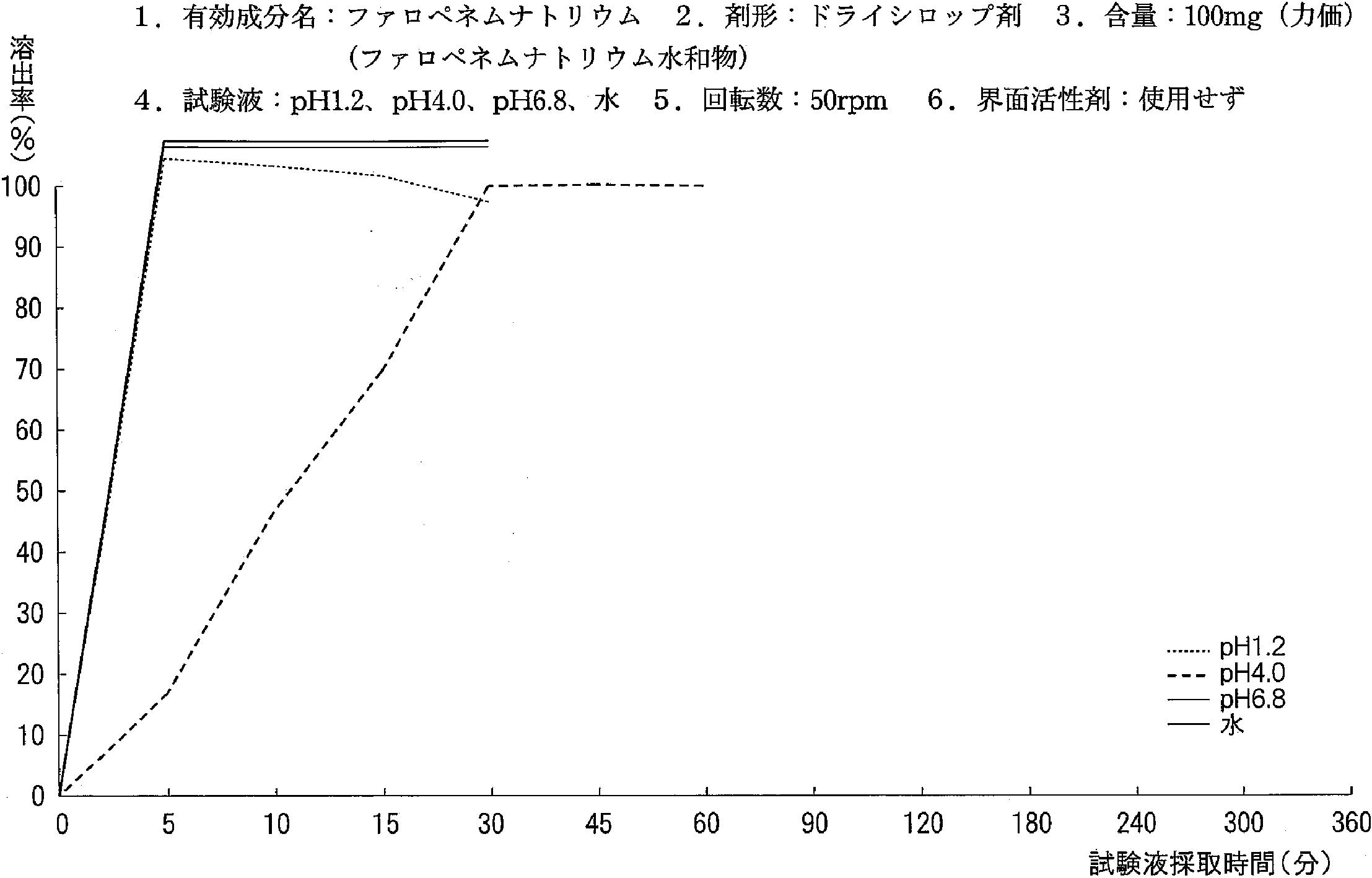 | 溶出曲线测定例 | 成分名称:ファロペネムナトリウム(ファロペネムナトリウム水和物) 英文名:Faropenem Sodium Hydrate 含量:100mg(力価)/g ![]() |