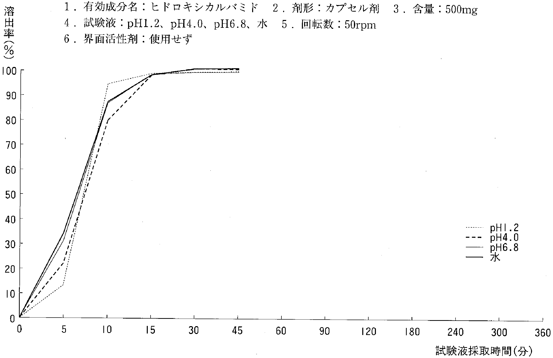 | 溶出曲线测定例 | 成分名称:ヒドロキシカルバミド 英文名:Hydroxycarbamide 含量:500mg ![]() |