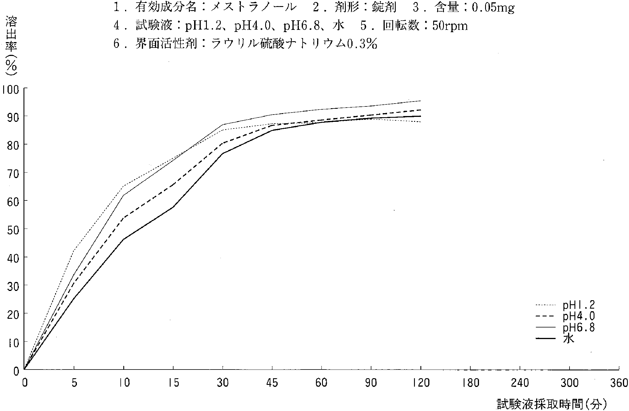 | 溶出曲线测定例 | 成分名称:メストラノール 英文名:Mestranol 含量:0.05mg ![]() |