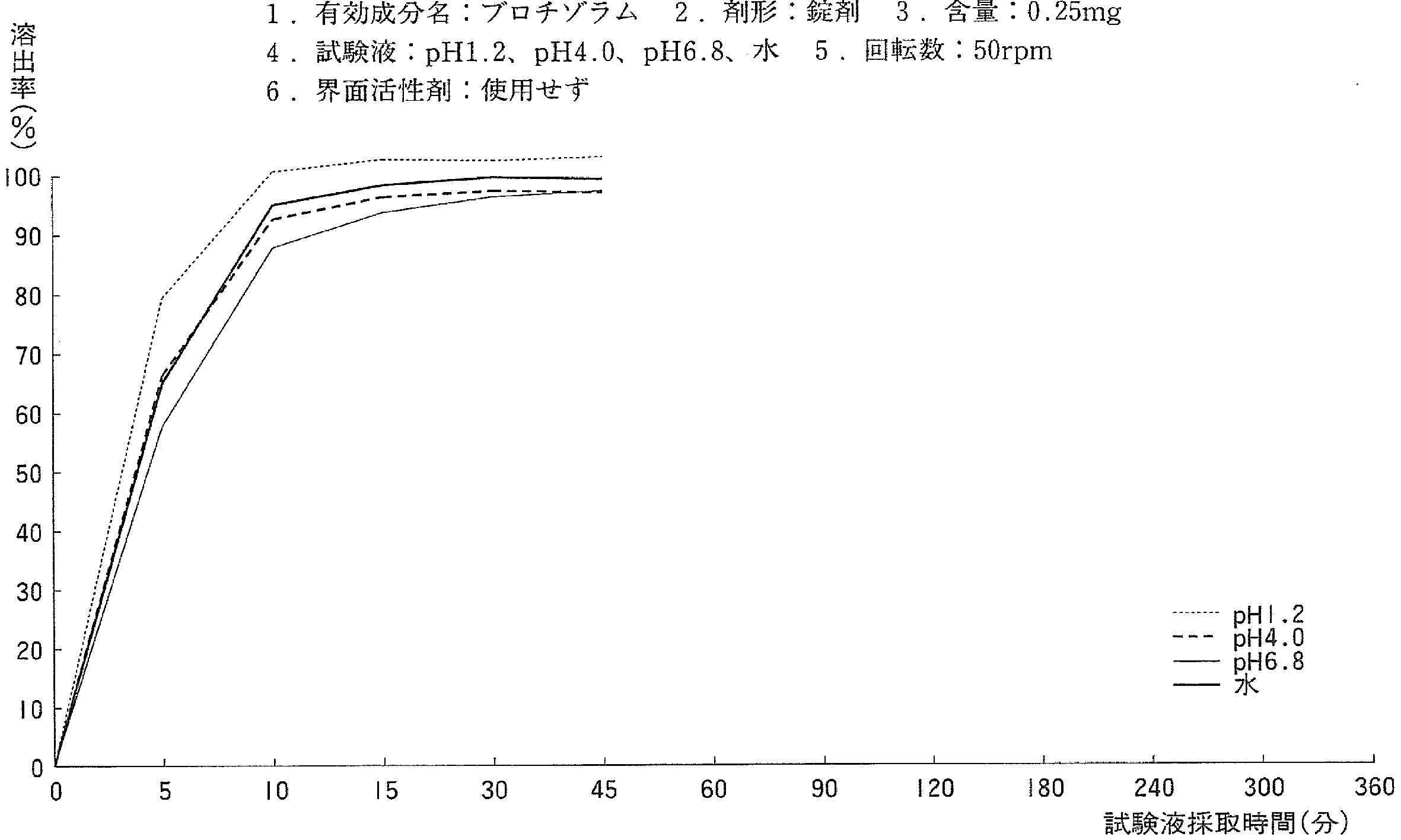| 溶出曲线测定例 | 成分名称:ブロチゾラム 英文名:Brotizolam 含量:0.25mg ![]() |