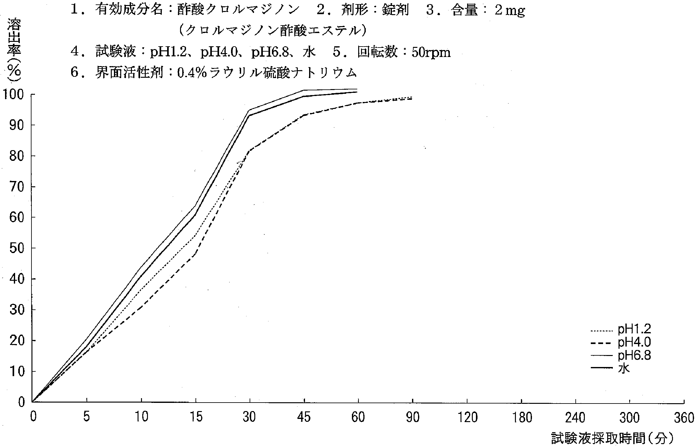 | 溶出曲线测定例 | 成分名称:酢酸クロルマジノン(クロルマジノン酢酸エステル) 英文名:Chlormadinone Acetate 含量:2mg ![]() |