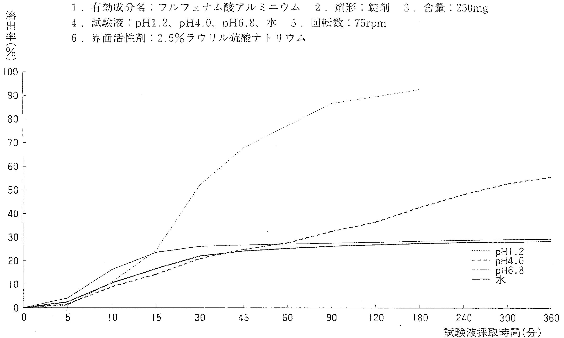 | 溶出曲线测定例 | 成分名称:フルフェナム酸アルミニウム 英文名:Flufenamic Acid Aluminum 含量:250mg ![]() |