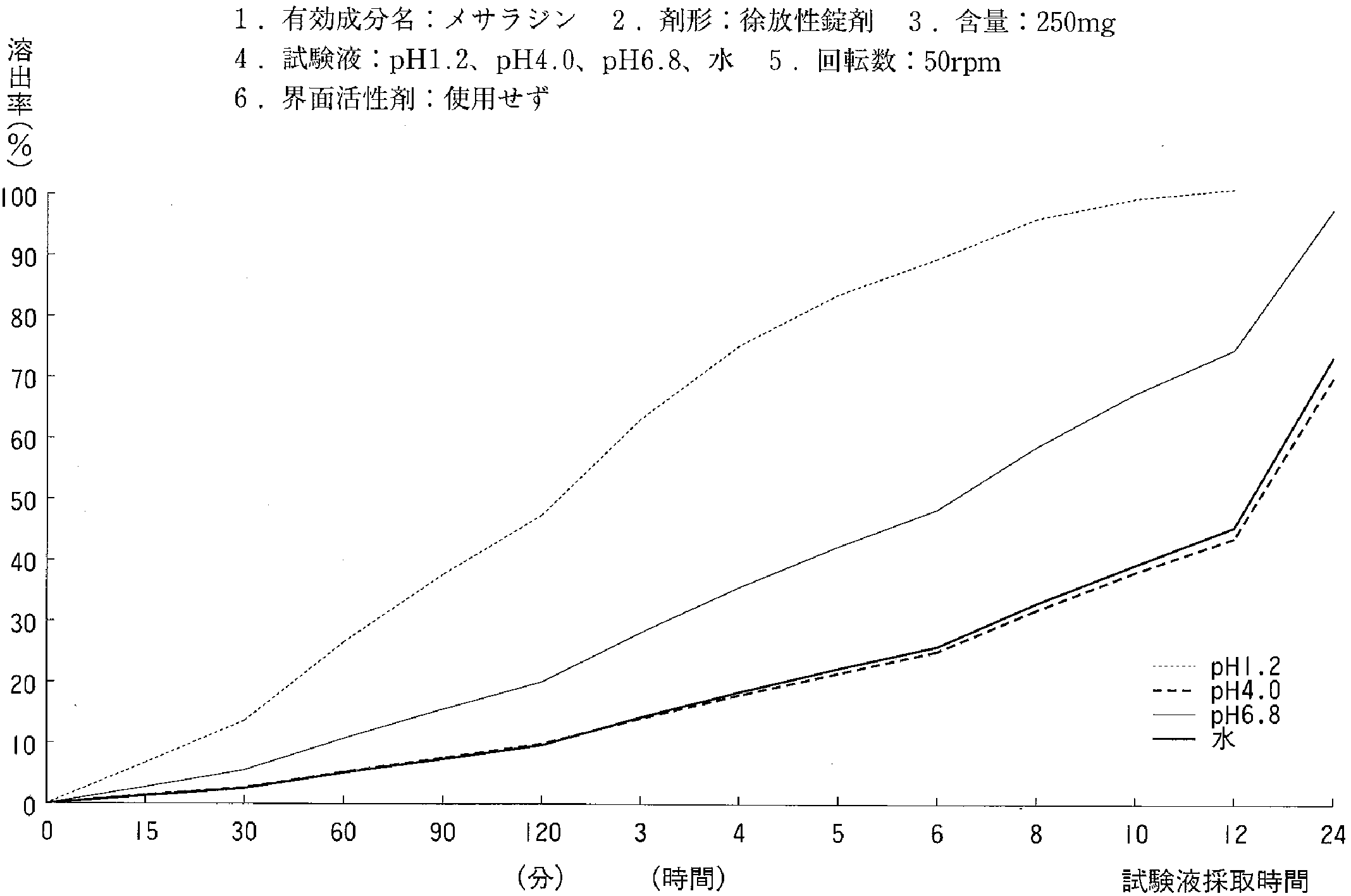 | 溶出曲线测定例 | 成分名称:メサラジン 英文名:Mesalazine 含量:250mg ![]() |