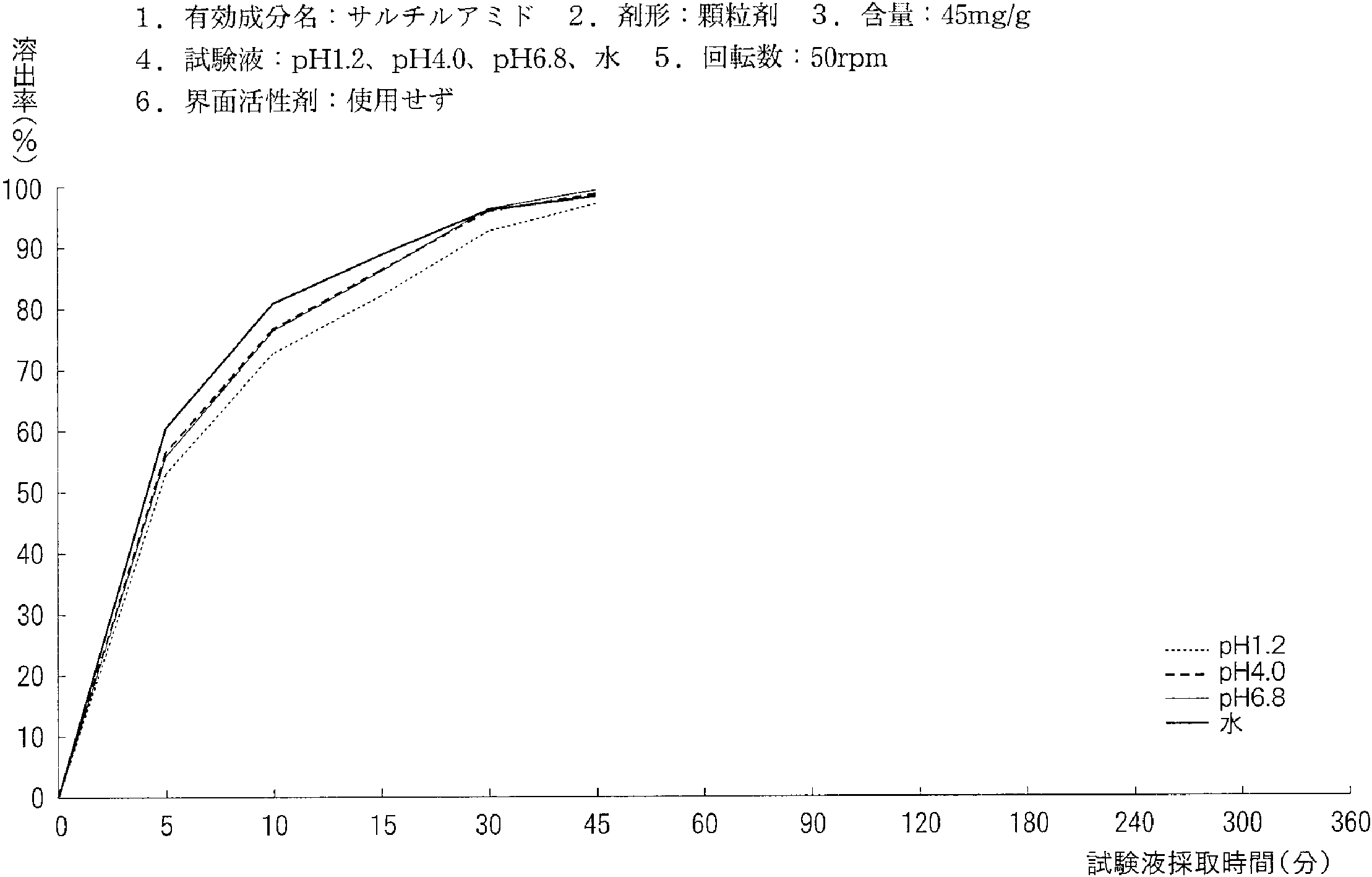 | 溶出曲线测定例 | 成分名称:サリチルアミド 英文名:Salicylamide 含量:45mg/g ![]() |