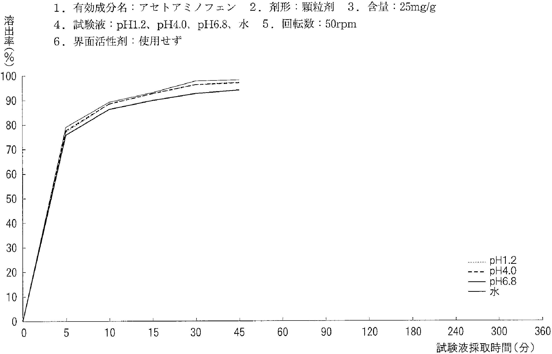 | 溶出曲线测定例 | 成分名称:アセトアミノフェン 英文名:Acetaminophen 含量:25mg/g ![]() |