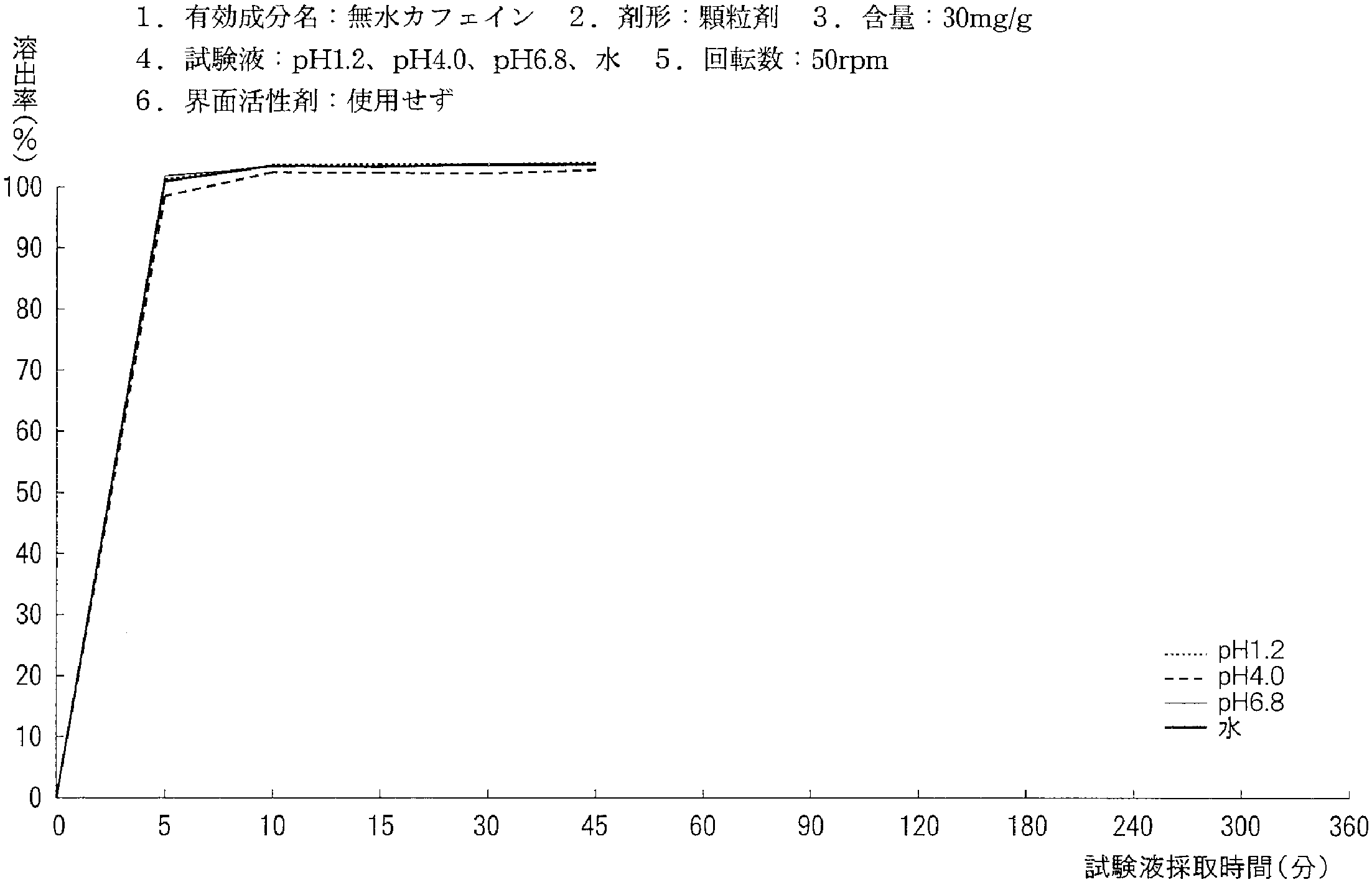 | 溶出曲线测定例 | 成分名称:無水カフェイン 英文名:Anhydrous Caffeine 含量:30mg/g ![]() |