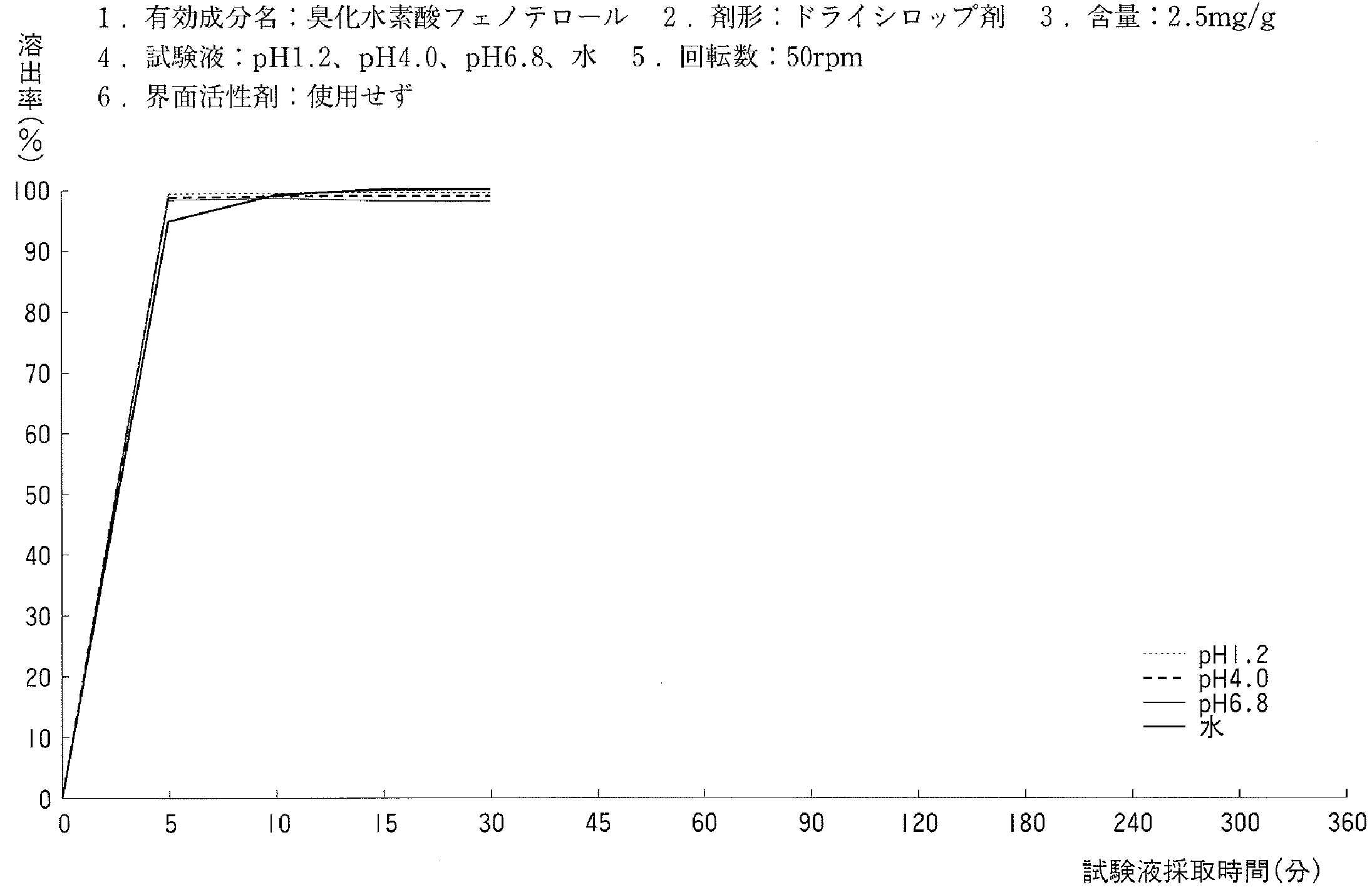 | 溶出曲线测定例 | 成分名称:臭化水素酸フェノテロール 英文名:Fenoterol Hydrobromide 含量:2.5mg/g ![]() |