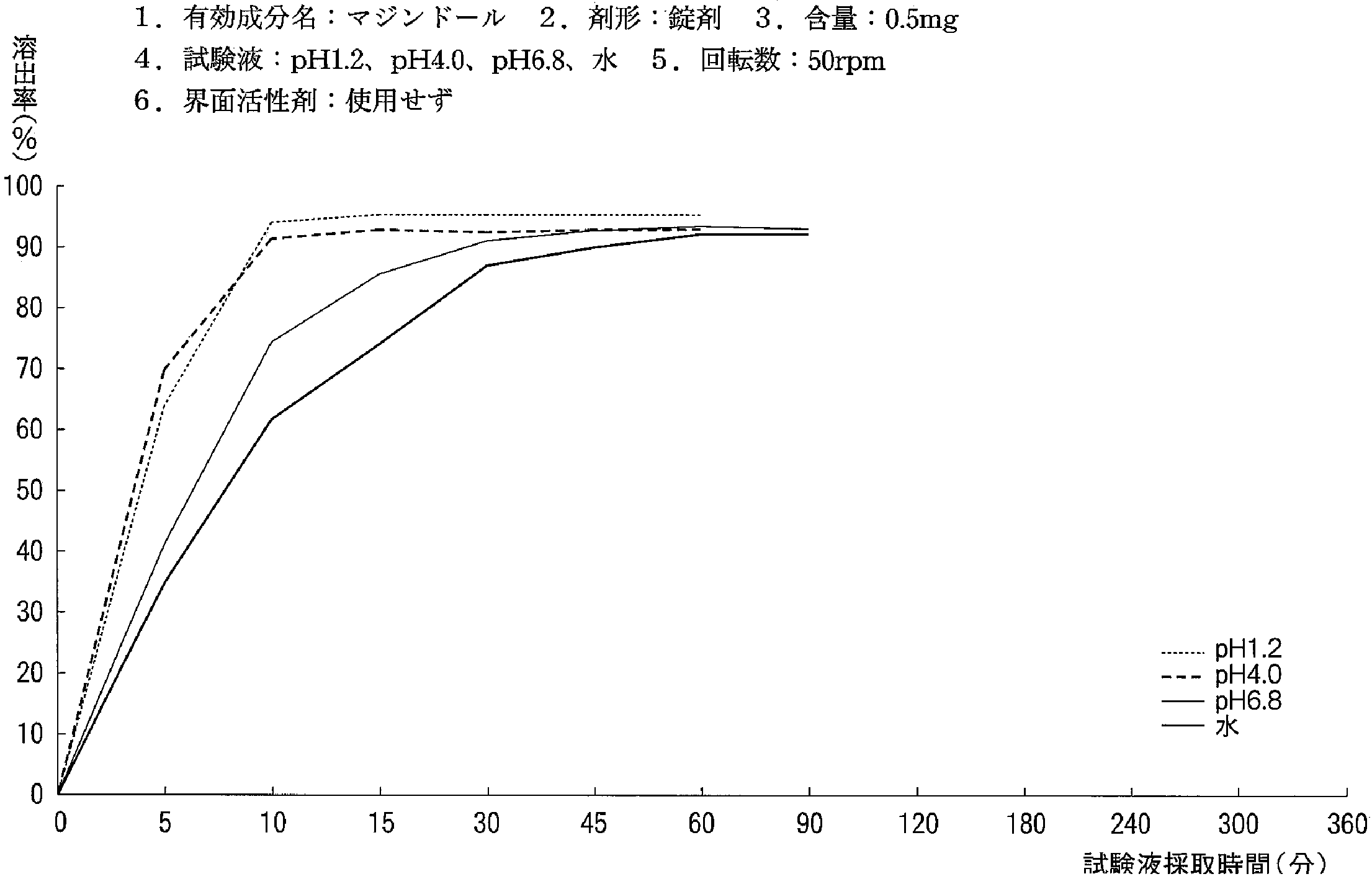 | 溶出曲线测定例 | 成分名称:マジンドール 英文名:Mazindol 含量:0.5mg ![]() |