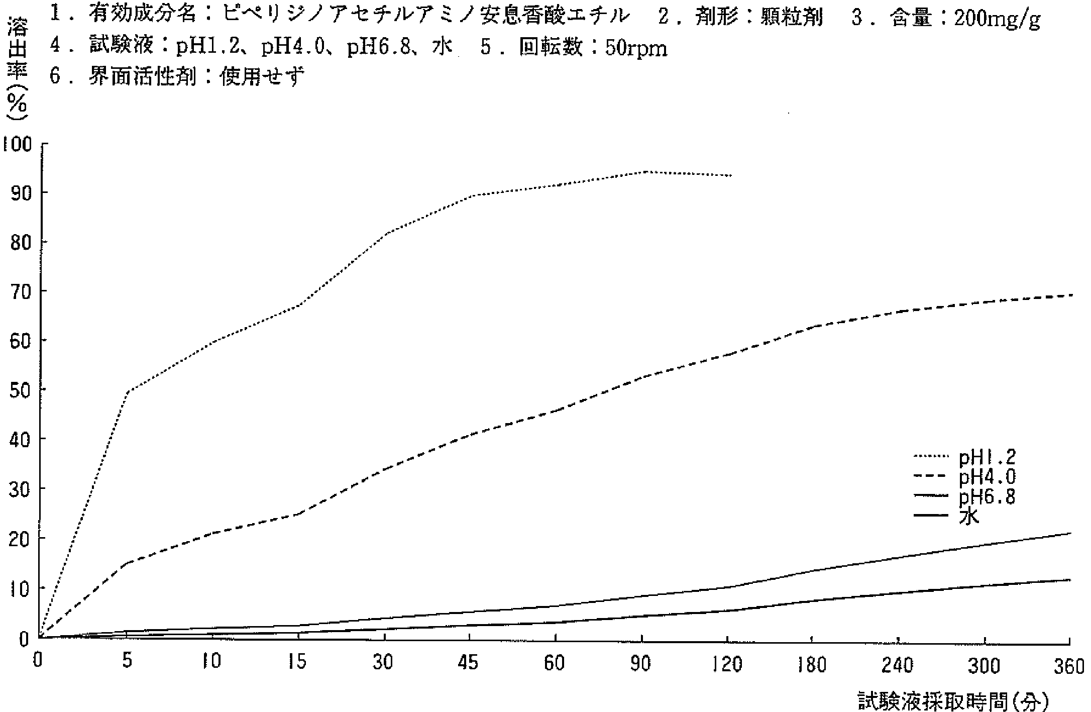 | 溶出曲线测定例 | 成分名称:ピペリジノアセチルアミノ安息香酸エチル 英文名:Ethyl p-Piperidinoacetylaminobenzoate 含量:200mg/g ![]() |