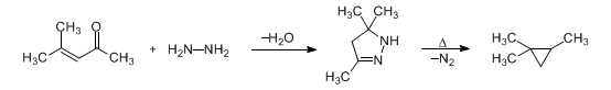 | 213. | Kishner Cyclopropane Synthesis N. M. Kishner, A. Zavadovskii, J. Russ. Phys. Chem. Soc. 43, 1132 (1911). Formation of cyclopropane derivatives by decomposition of pyrazolines formed by reacting α,β-unsaturated ketones or aldehydes with hydrazine: