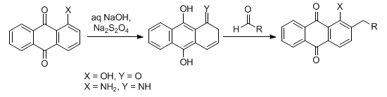 | 245. | Marschalk Reaction C. Marschalk et al., Bull. Soc. Chim. Fr. 3, 1545 (1936). Sodium dithionite reduction of 1-hydroxy- or aminoanthraquinones to their leuco-forms, followed by condensation with aldehydes to yield the 2-alkylated anthraquinones. 2-Hydroxyanthraquinones yield 1-alkylated products: