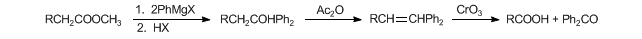 | 018. | Barbier-Wieland Degradation H. Wieland, Ber. 45, 484 (1912); P. Barbier, R. Locquin, Compt. Rend. 156, 1443 (1913). Stepwise carboxylic acid degradation of aliphatic acids (particularly in sterol side chains) to the next lower homolog. The ester is converted to a tertiary alcohol that is dehydrated with acetic anhydride, and the olefin oxidized with chromic acid to a lower homologous carboxylic acid: