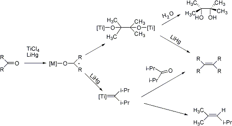 Synthetic application: A. Fürstner, D. N. Jumbam, Tetrahedron 48, 5991 (1992); M. Rucker, R. Brückner, Tetrahedron Letters 38, 7353 (1997); P. Harter et al., Polyhedron 17, 1141 (1998). Modified conditions: T. A. Lipski et al., J. Org. Chem. 62, 4566 (1997); S. Talukdar et al., ibid. 63, 4925 (1998). Reviews: J. E. McMurry, Chem. Rev. 89, 1513-1524 (1989); G. M. Robertson, Comp. Org. Syn. 3, 583-595 (1991); T. Lectka, Act. Met. 1996, 85-131; M. Ephritikhine, Chem. Commun. 23, 2549-2554 (1998). Cf. Barton Olefin Synthesis. |